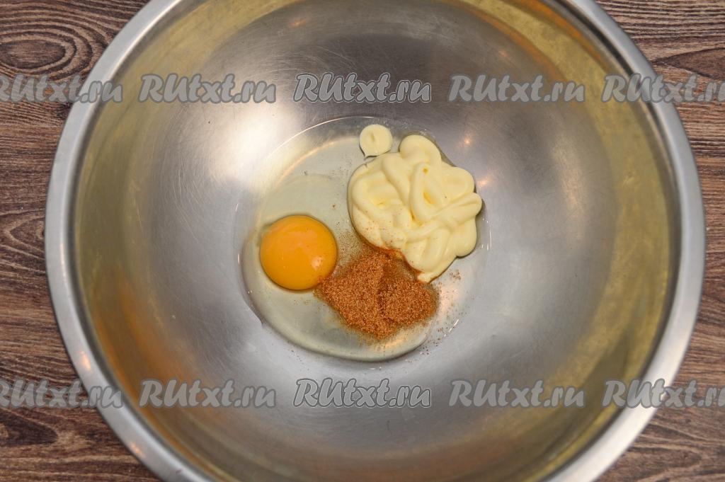 Для приготовления кляра нужно в миске соединить сырое яйцо, майонез и специи (я использовала специи для курицы и индейки).