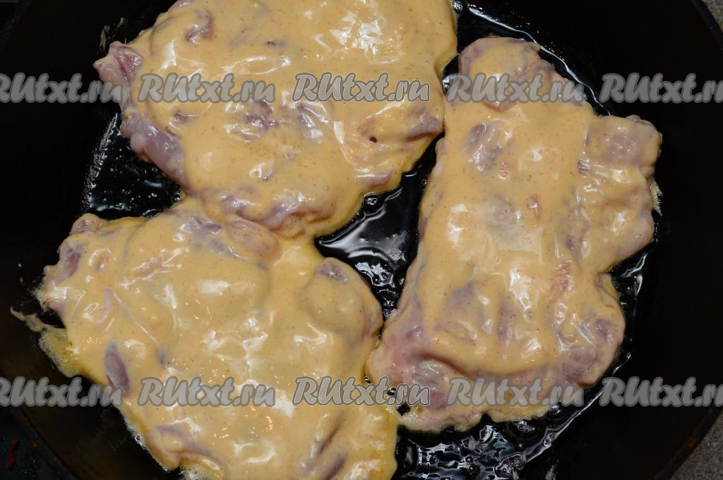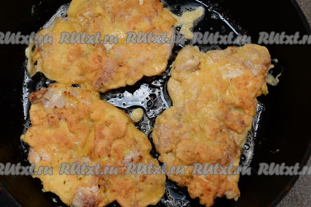 Сковороду хорошо разогреть с растительным маслом. Выложить на сковороду отбивные из филе куриных бёдер, покрытые кляром. Жарить мясо на среднем огне примерно 5 минут (до подрумянивания снизу).