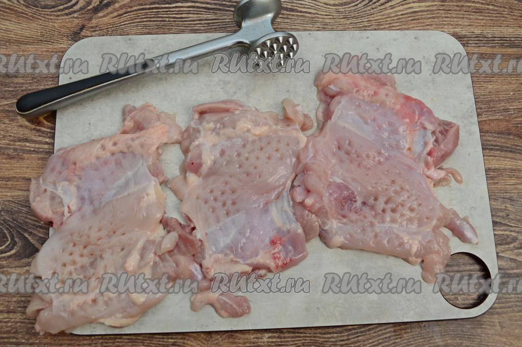 Отбить каждое филе при помощи кулинарного молоточка с одной стороны до толщины примерно 1 сантиметр. Посолить мясо по вкусу.
