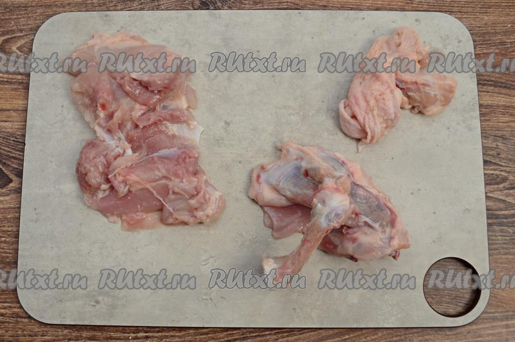 С куриных бёдер снять кожу. Жир я тоже срезаю, но это по желанию. Затем разделать бёдра на филе, для этого нужно разрезать бедро по кости (я разрезаю с помощью кухонных ножниц, но можно использовать и острый нож).