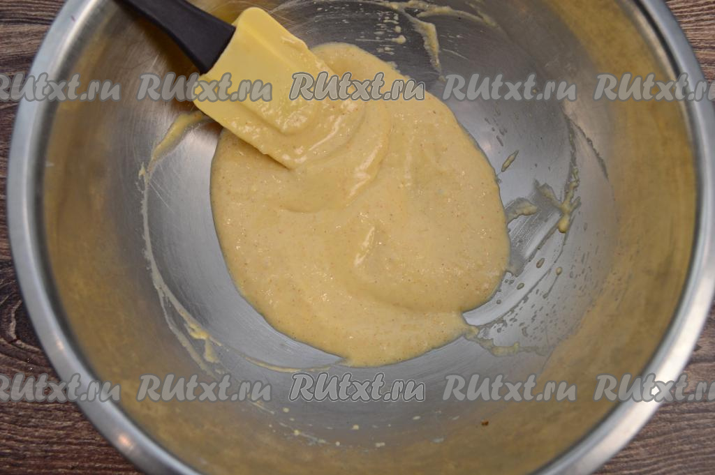 Затем в получившуюся смесь всыпать 1 столовую ложку муки, перемешать кляр до однородности.