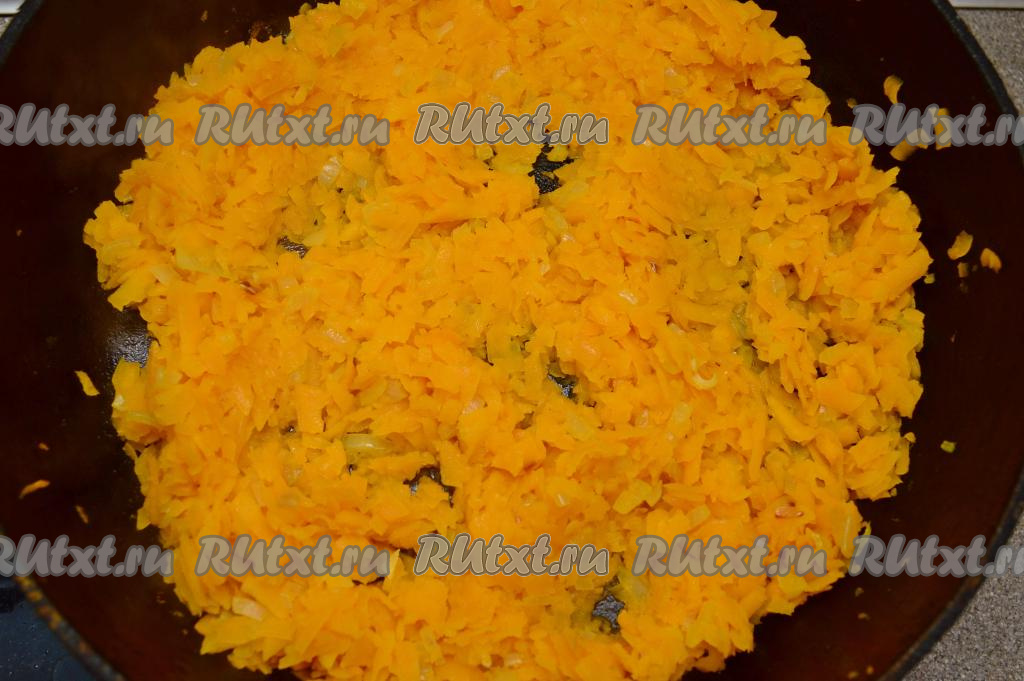 После того как лук обжарится до прозрачности, добавить к нему натёртую тыкву, перемешать овощи. Обжарить тыкву до мягкости (я обжаривала 5 минут), периодически перемешивая, затем добавить соль, сахар, перемешать, прогреть 1 минуту, убрать с огня. Попробовать начинку для чуду на вкус, если вам мало сладости, можно добавить ещё немного сахара. Я добавила в начинку в общей сложности 0,5 столовой ложки сахара, этого было вполне достаточно, чтобы начинка вышла в меру сладкой. Дать начинке полностью остыть.
