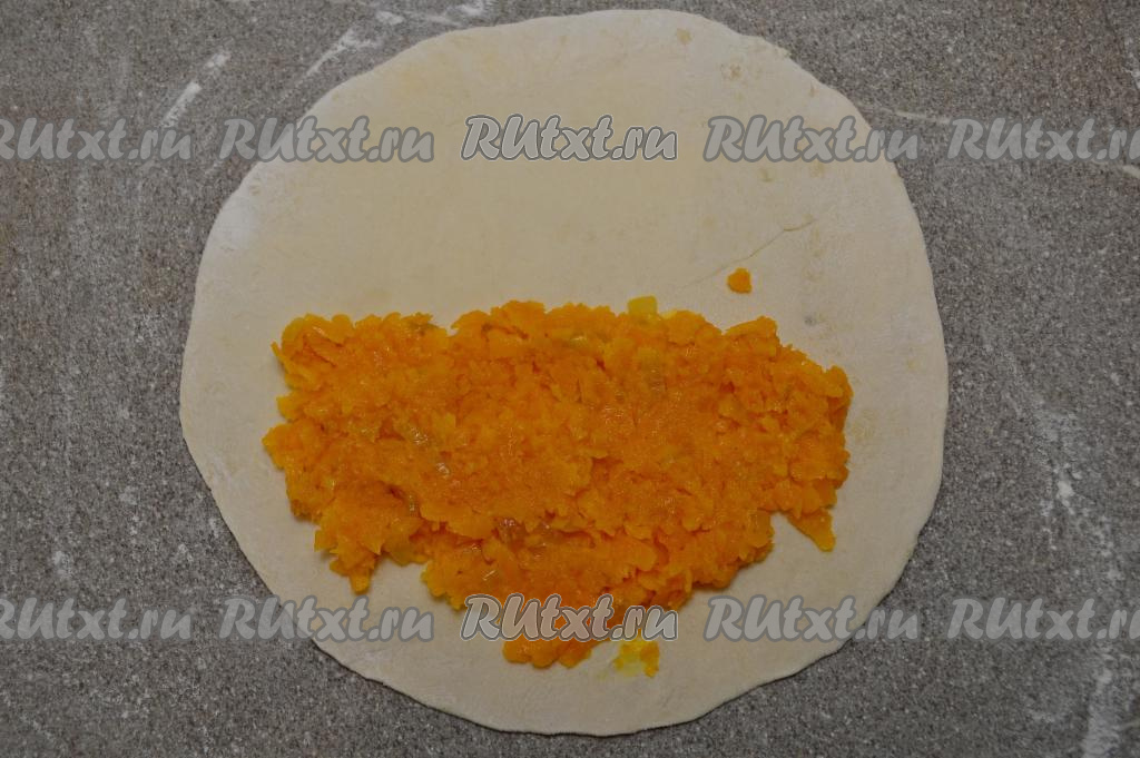 Выложить на одну половину круга 2 столовых ложки тыквенной начинки, отступая от краёв примерено по 2 сантиметра.
