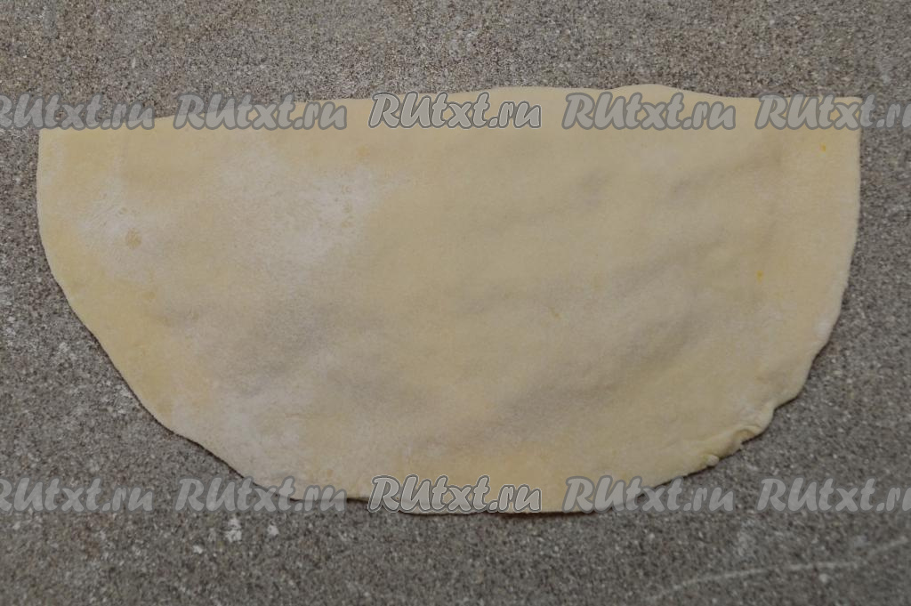 На припылённом мукой столе раскатать вначале один шарик теста в круг толщиной 2 миллиметра и диаметром около 24 сантиметров.