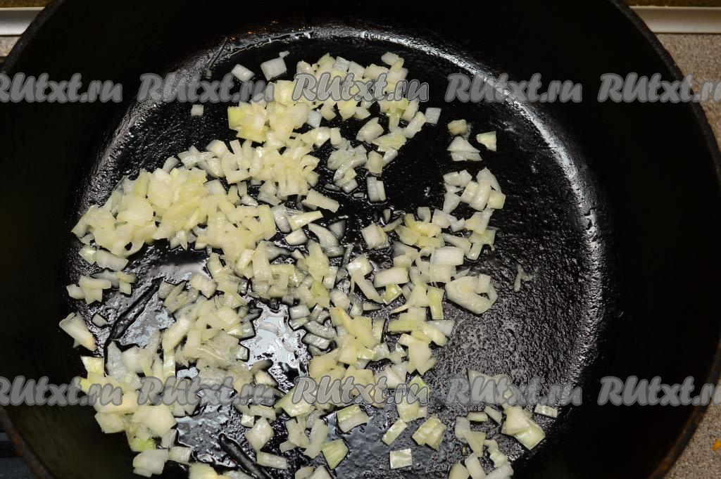 Пока тесто отдыхает, нужно заняться тыквенной начинкой для чуду. Для этого лук нужно очистить, нарезать мелко и выложить в сковороду, разогретую с растительным маслом. Обжарить лук до прозрачности (ориентировочно в течение 3-4 минут), иногда помешивая, на среднем огне.