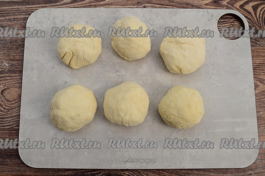 Из каждой части теста скатать шар. Если тесто будет сильно липнуть к рукам, тогда припыляйте руки мукой, скатывая каждую часть теста в шар.