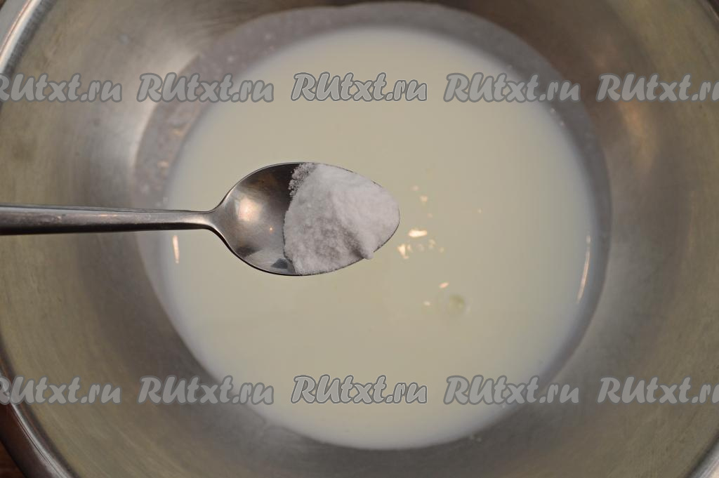 Кефир подогреть до комнатной температуры (я подогрела в течение 30 секунд в микроволновке, но можно просто заранее достать его из холодильника). Влить кефир в глубокую миску, всыпать соду, перемешать и оставить минут на 5.