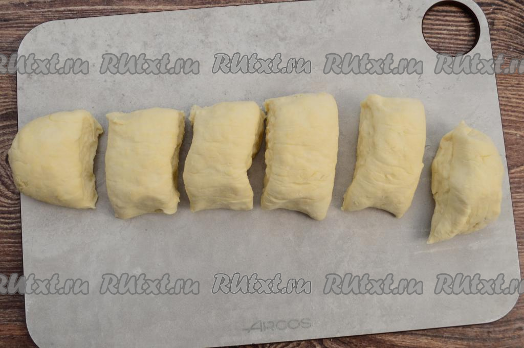 По прошествии 40 минут из "отдохнувшего" теста можно начать формировать лепёшки "Чуду". Тесто скатать в рулет, нарезать на 6 равных частей.