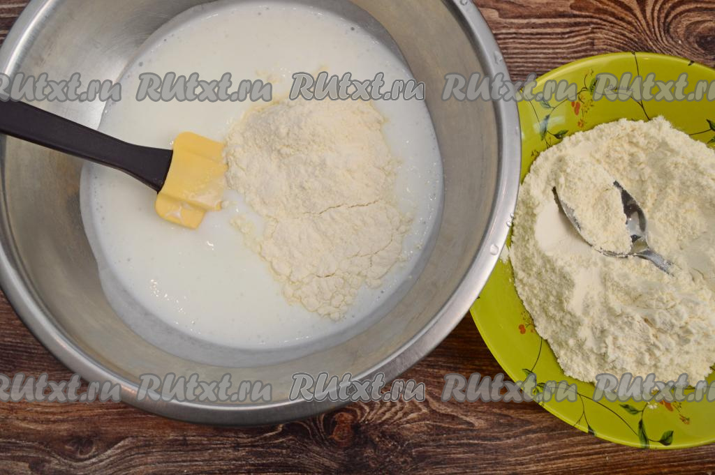 По прошествии 5 минут кефир вступит в реакцию с содой, поэтому смесь увеличится в объёме, поверхность покроется пузырьками. В миску со смесью кефира и соды всыпать соль и 150 грамм муки, перемешать тесто для чуду лопаткой. Затем понемногу подсыпать в тесто оставшуюся муку, очень хорошо вмешивая её. Как только тесто перемешивать лопаткой станет сложно, начать вымешивать его руками.