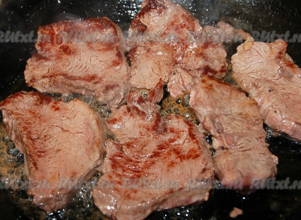 Кусочки мяса обжарить на растительном масле до легкой румяности. Примерно по 3 минуты с каждой стороны.
