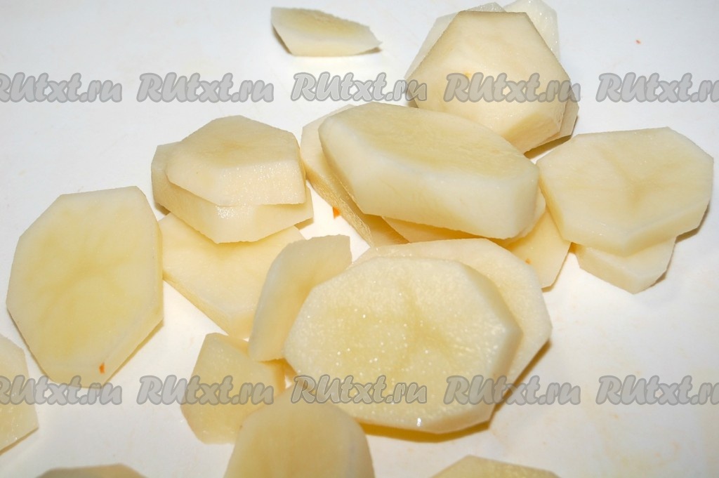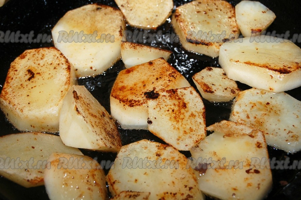 Нарезать картофель круглыми кусочками и слегка обжарить на растительном масле.