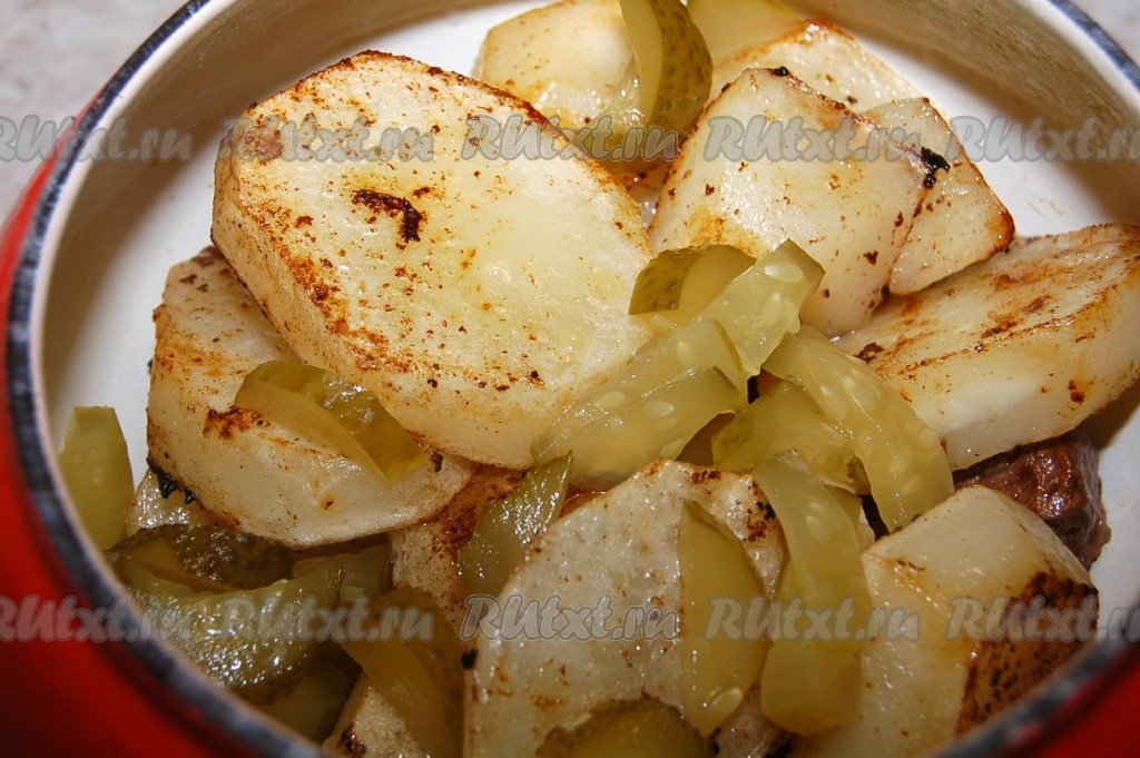 Обжаренный картофель выложить в горшочек к мясу, добавив нарезанный соленый огурец.