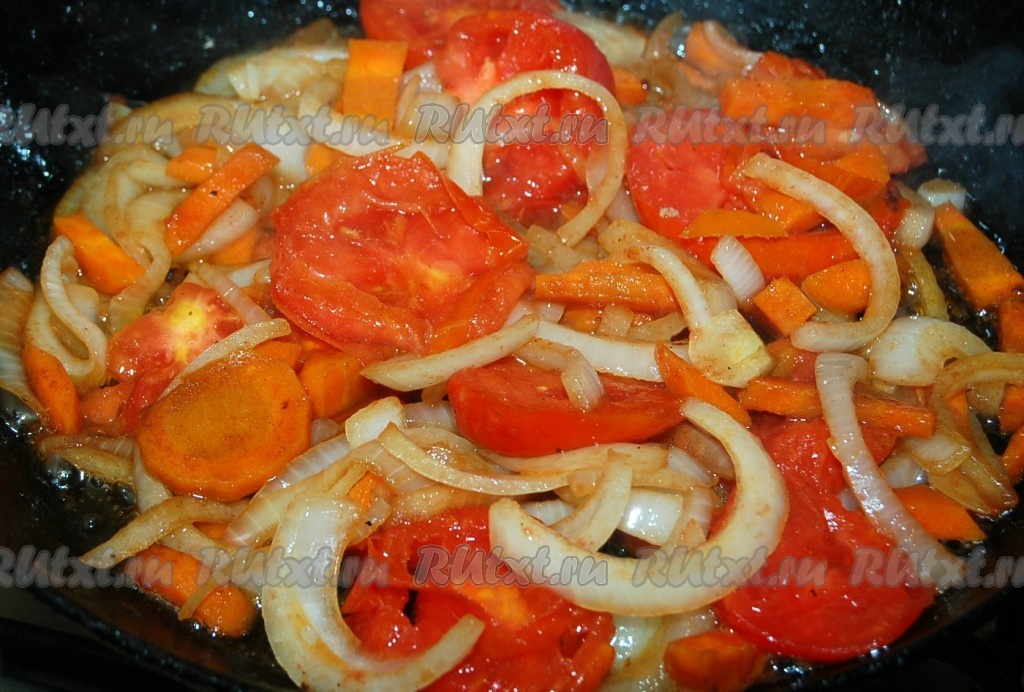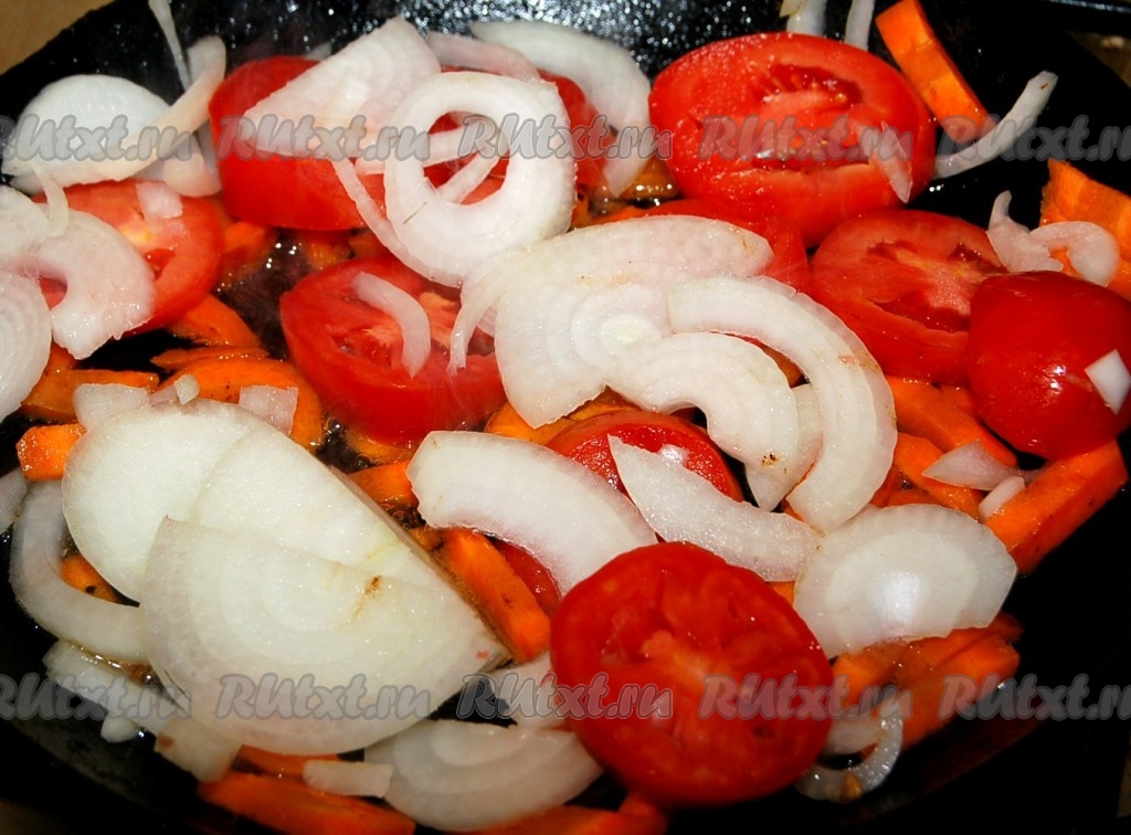 Нарезать морковь, помидоры и лук небольшими кусочками и слегка обжарить на растительном масле.