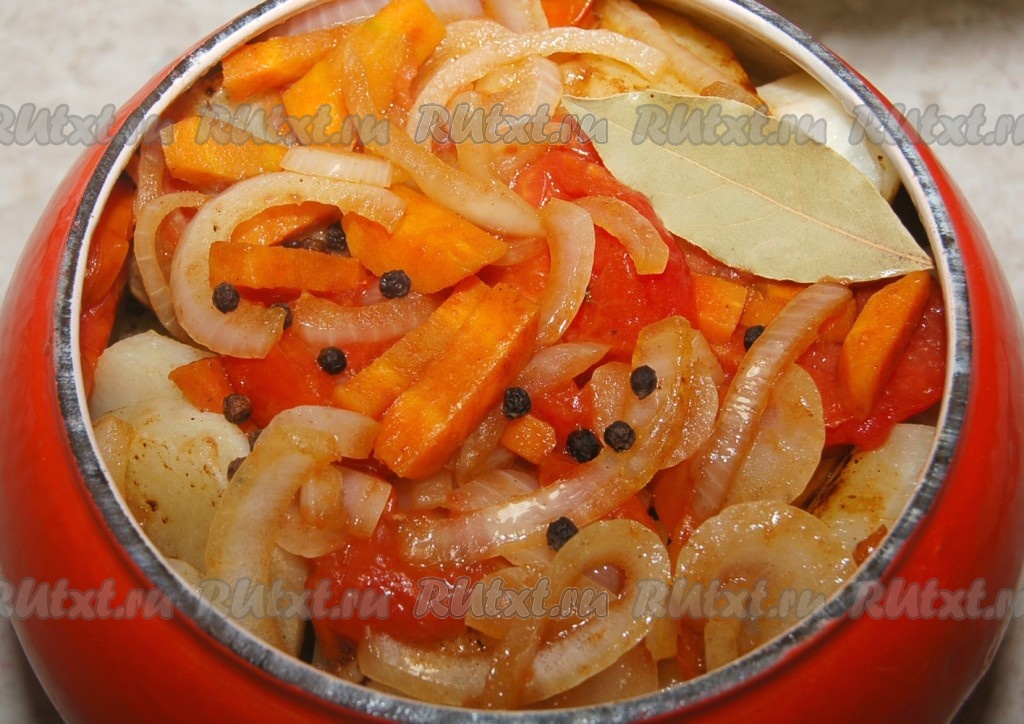 Обжарку из помидор, моркови и лука выложить в горшочек. Добавить горячую воду, лавровый лист, черный перец горошком, специи по вкусу, соль.