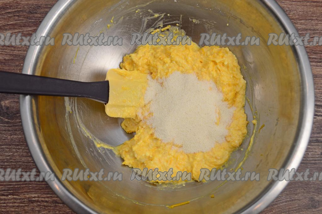 Затем всыпать в миску манную крупу.