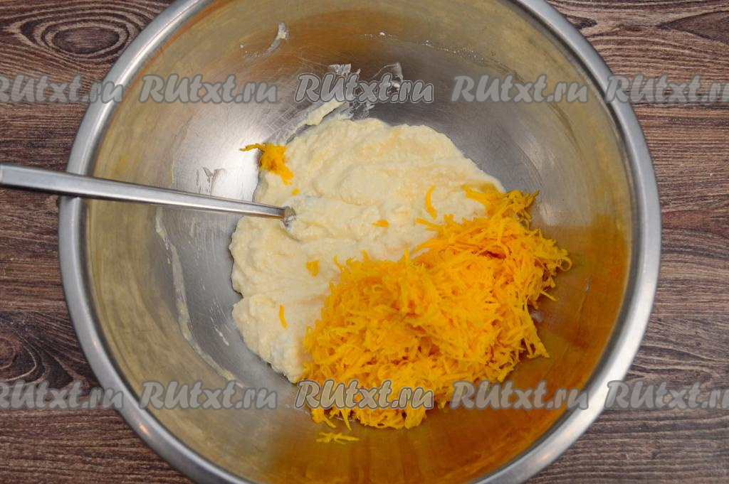 Тыкву очистить от кожуры, волокнистой части и семечек. Для приготовления запеканки потребуется 150 грамм очищенной тыквы. Натереть тыкву на мелкой тёрке, добавить в миску с творожной массой.