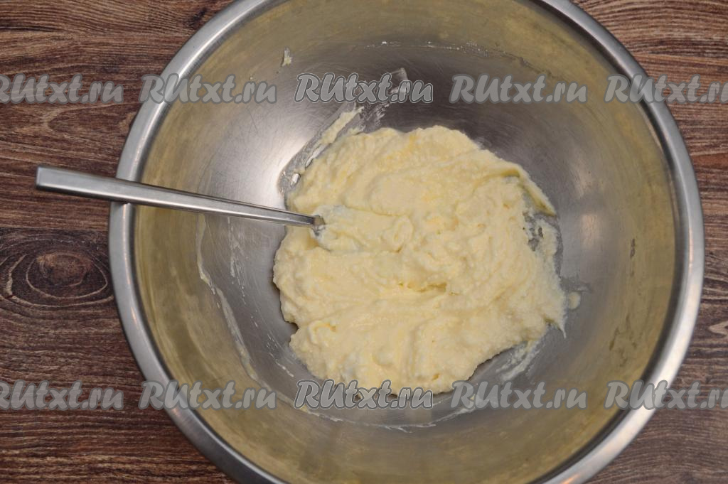 Растереть творог с яйцом и сахаром с помощью вилки (или лопатки) до получения однородной творожной массы.
