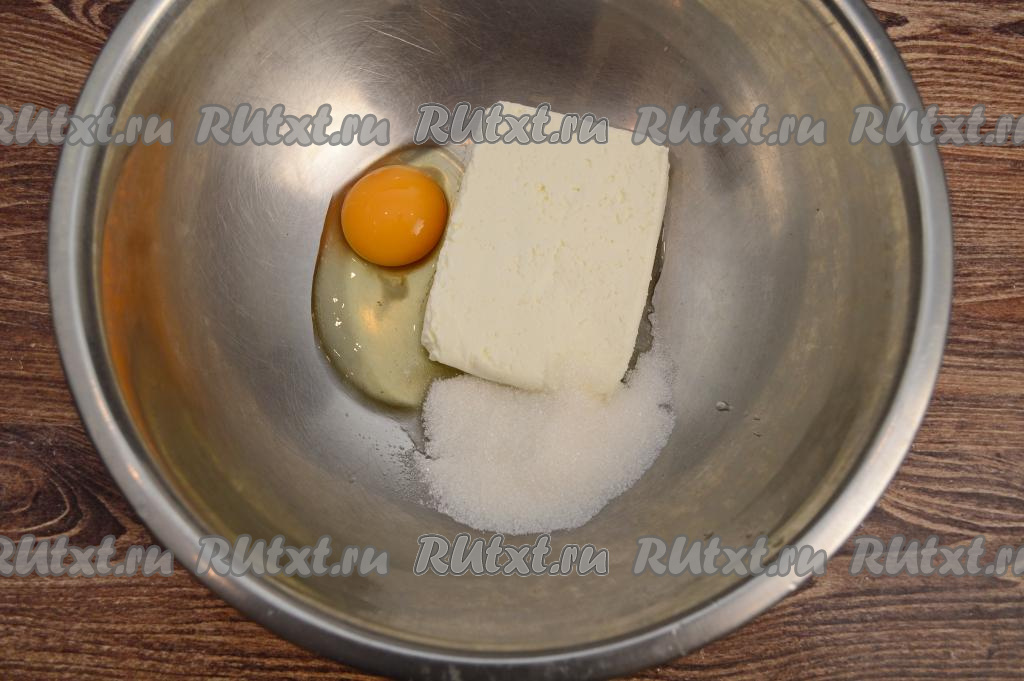 В миску выложить творог, сырое яйцо и сахар.