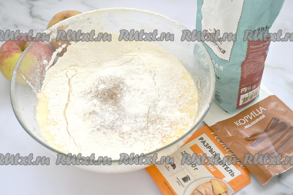 К яйцам, взбитым с сахаром, всыпаем весь разрыхлитель, грамм 70 рисовой муки и корицу.