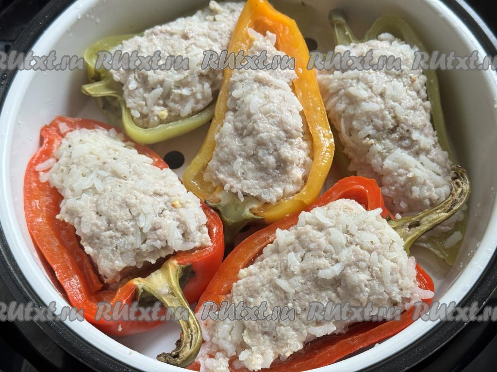 Как только прозвучит сигнал, сообщающий о том, что вода в чаше мультиварки закипела, установить поддон для приготовления на пару, заполненный фаршированными перцами, в чашу мультиварки. Закрыть крышку мультиварки, готовить на режиме "На пару" 30 минут.