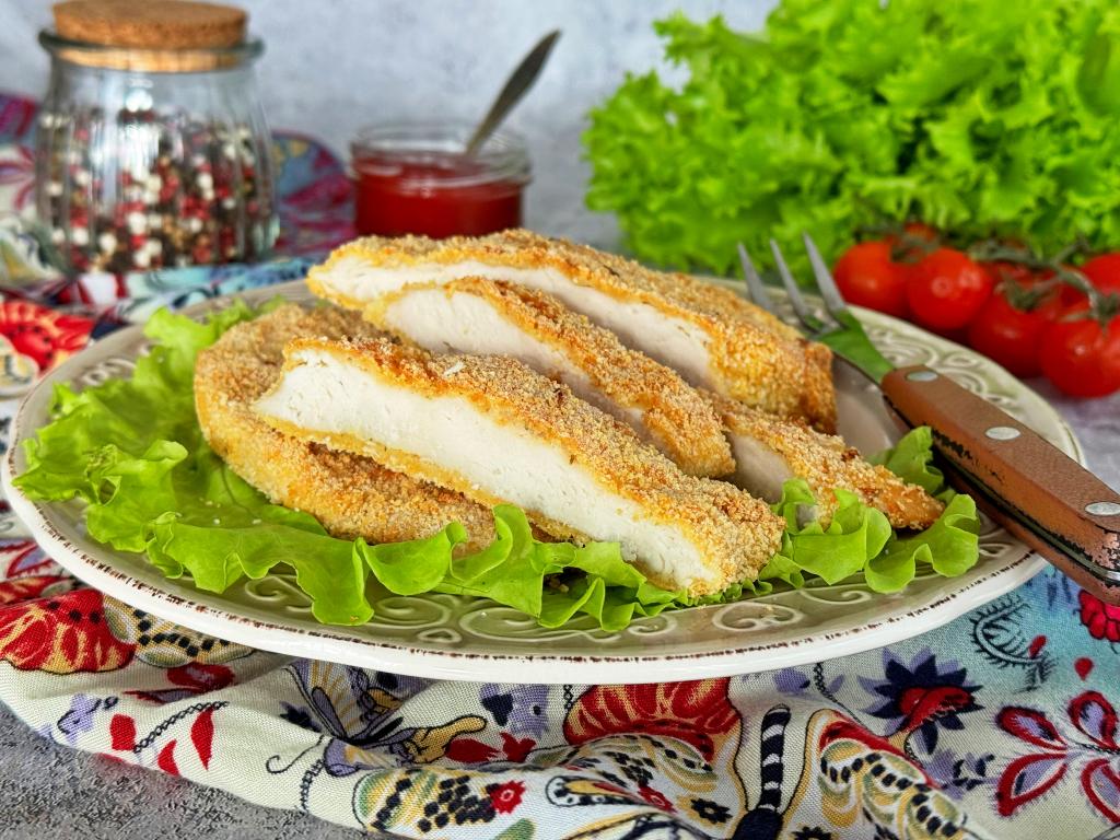 Нежные, вкусные куриные шницели, покрытые аппетитной панировкой, переложить из чаши аэрогриля на тарелку и подать к столу.