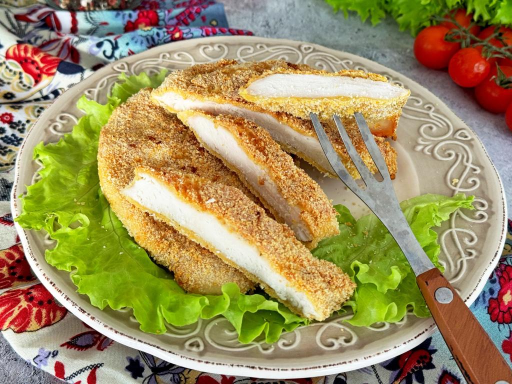 Аэрогриль отлично подходит для запекания мяса курицы. Поэтому решила приготовить в аэрогриле куриные шницели в панировке. Мясо перед запеканием дважды покрывается яйцом и панировочными сухарями. Куриные шницели, покрытые двойной панировкой, получаются аппетитными, нежными, вкусными. Рецепт простой, а результат вас точно не разочарует. При подаче шницели можно дополнить любым гарниром (например, макаронами, картошкой или салатом из свежих овощей).