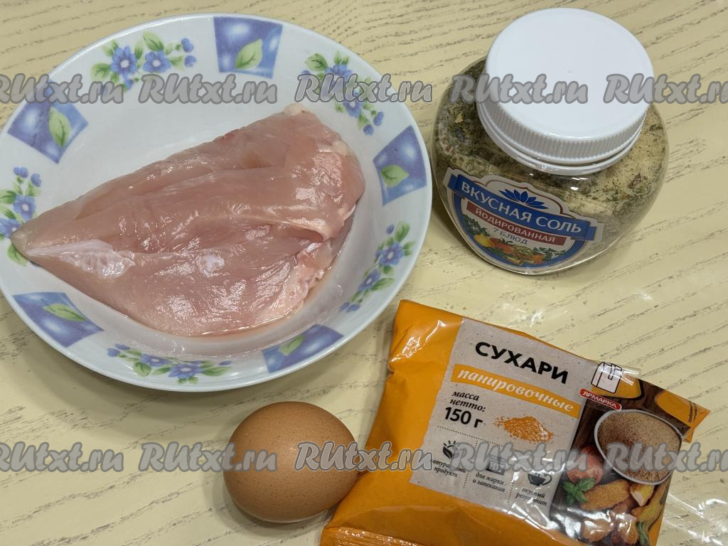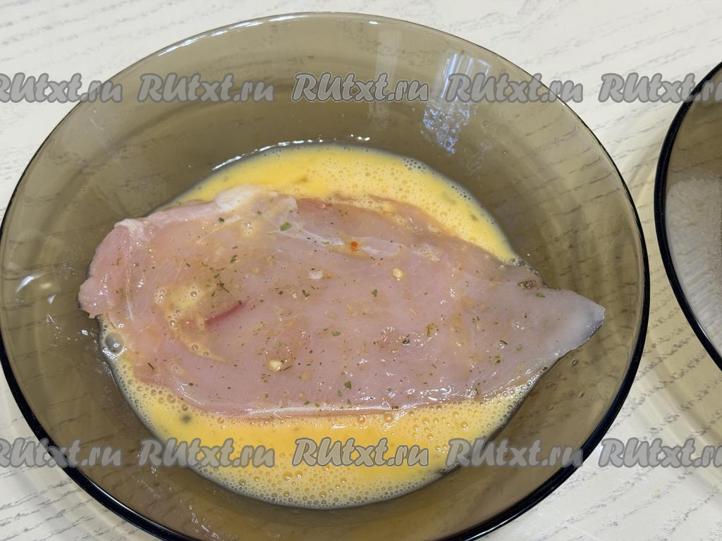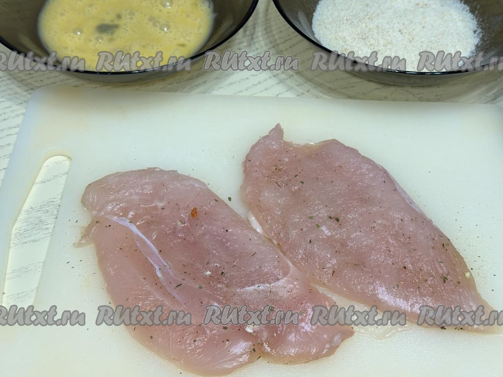 Отбитое куриное мясо посолить с двух сторон, посыпать специями (в качестве специй можно использовать, например, чёрный молотый перец, я готовила с солью, уже смешанной со специями). В одну глубокую тарелку разбить яйцо, взбить его вилкой до однородности. В другую тарелку насыпать панировочные сухари.