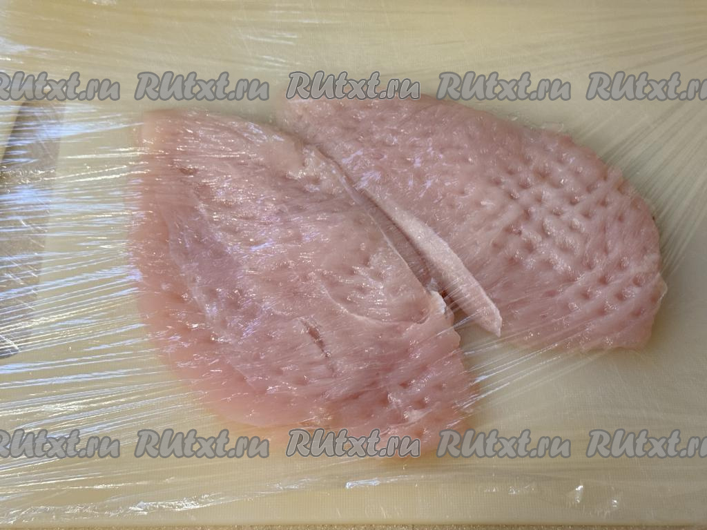 Накрыть мясо пищевой плёнкой и слегка отбить кулинарным молоточком с двух сторон.