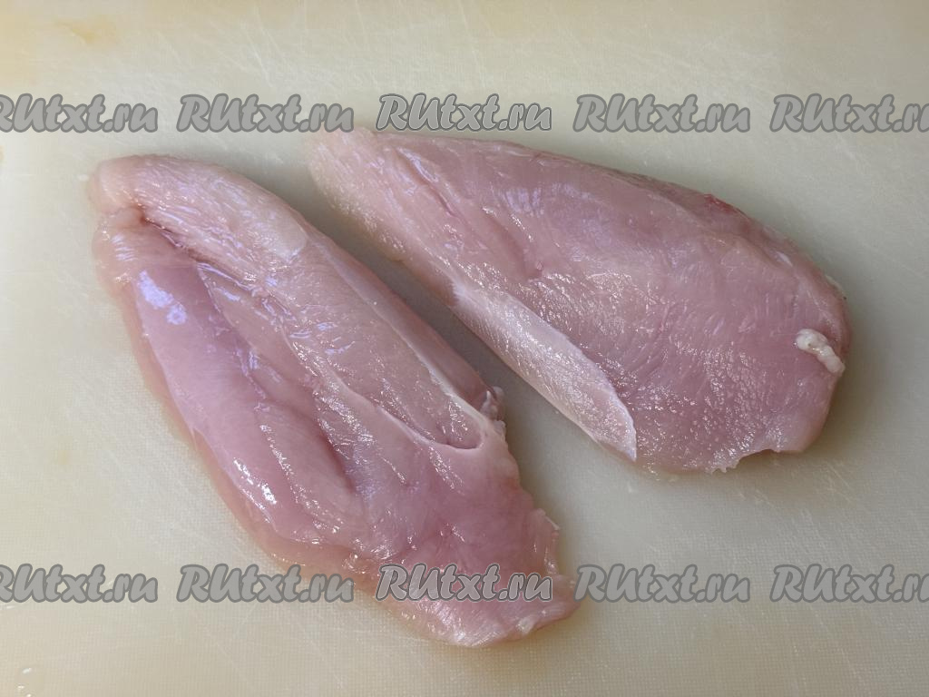 Разрезать куриное филе вдоль на две части.