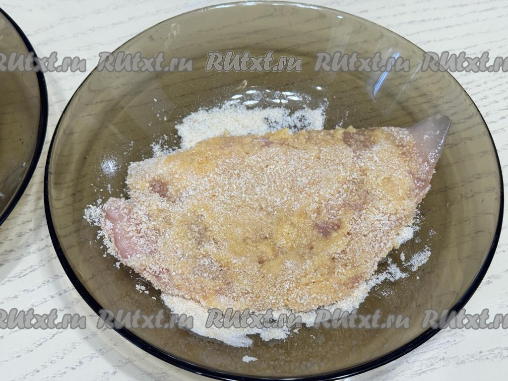 Мясо, покрытое яйцом, обвалять в панировочных сухарях с двух сторон, затем ещё раз покрыть яйцом с двух сторон и снова обвалять с двух сторон в панировочных сухарях. Получится куриный шницель в двойной панировке.