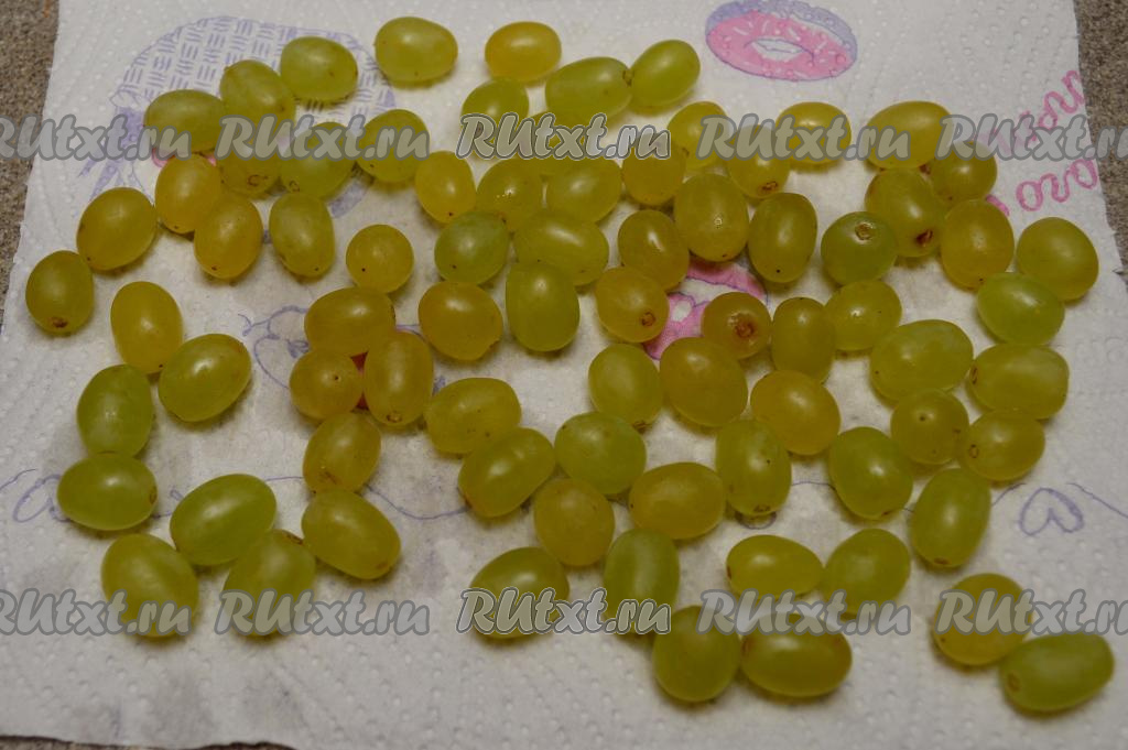 Первым делом виноград нужно промыть водой, обсушить, разложив его на бумажном полотенце (или на бумажных салфетках).