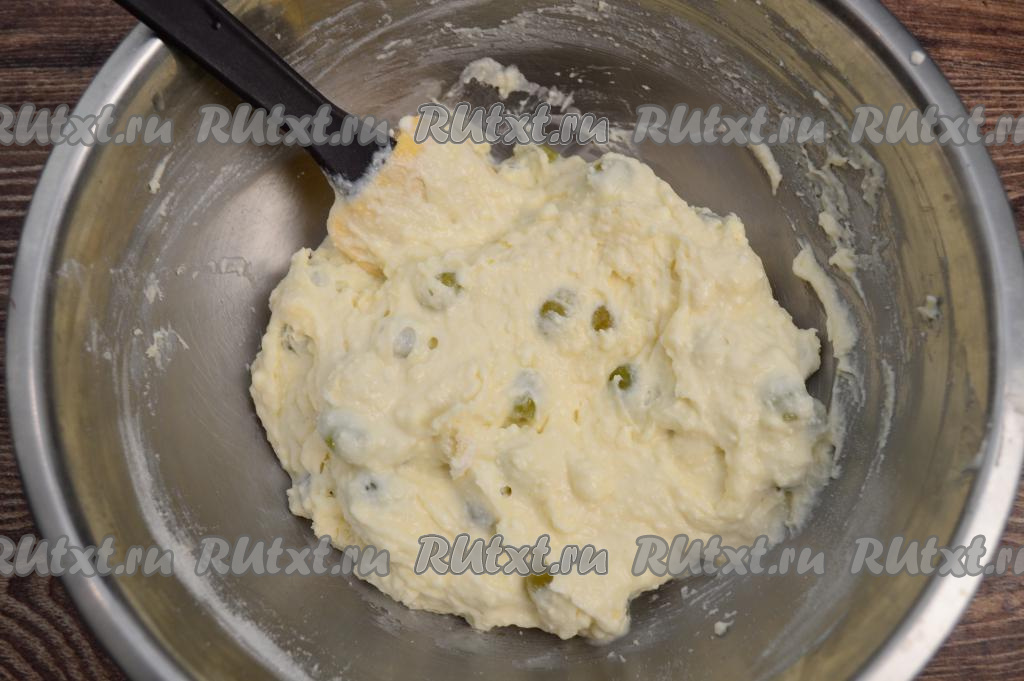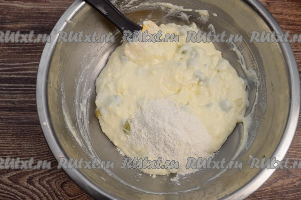 Перемешать виноград и творожную массу до однородности. Затем всыпать муку.