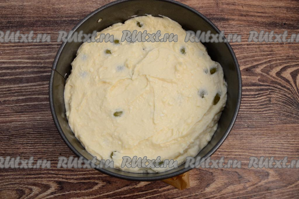 Дно формы для выпечки застелить пергаментом (у меня форма диаметром 19 сантиметров). Бока формы смазать растительным маслом. Выложить тесто в форму, разровнять его лопаткой.