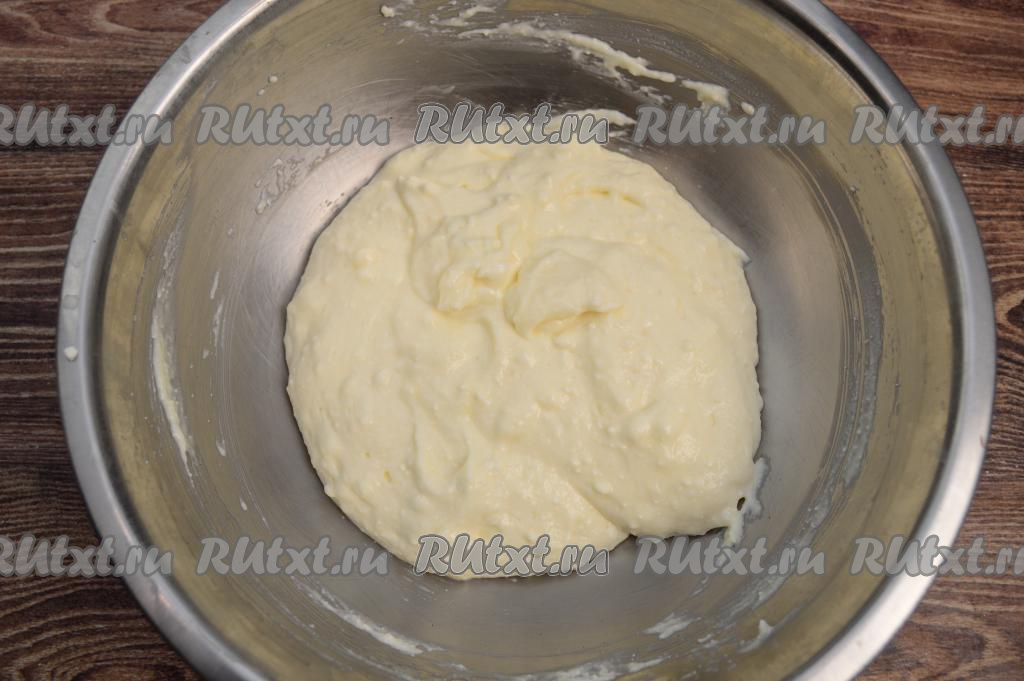 Вмешать муку в творожное тесто. Тесто для запеканки не любит много муки, я всего добавила 40 грамм муки. Тесто должно быть достаточно густым, но форму оно ещё не держит и медленно стекает с лопатки.