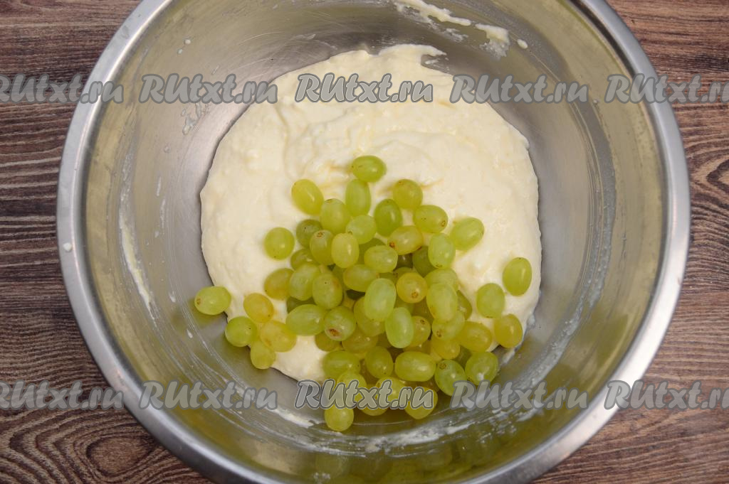 Затем в миску с получившейся творожной массой выложить обсушенный виноград. Виноград без косточек можно добавлять целиком. Если же в винограде есть косточки, тогда нужно будет разрезать каждую виноградинку вдоль и удалить косточки.