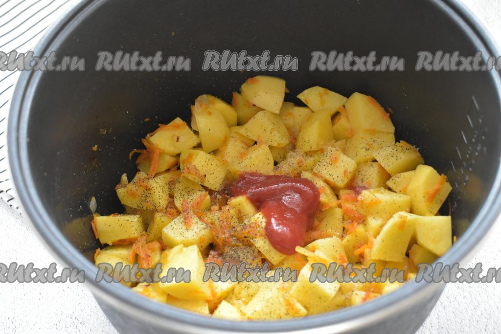 После окончания режима "Жарка" к картошке, обжаренной с морковкой и луком, добавляем томатный соус, по вкусу солим, всыпаем специи (у меня - чёрный молотый перец).