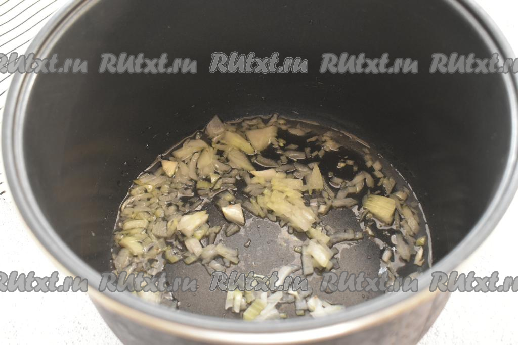 В съёмную чашу мультиварки вливаем растительное масло. Включаем режим "Жарка" на 15 минут. Вторую половину луковицы нарезаем мелко. Когда масло в мультиварке разогреется (прозвучит звуковой сигнал), выкладываем в чашу нарезанный лук, обжариваем его до прозрачности (примерно в течение 3 минут), иногда помешивая и не закрывая крышку мультиварки.