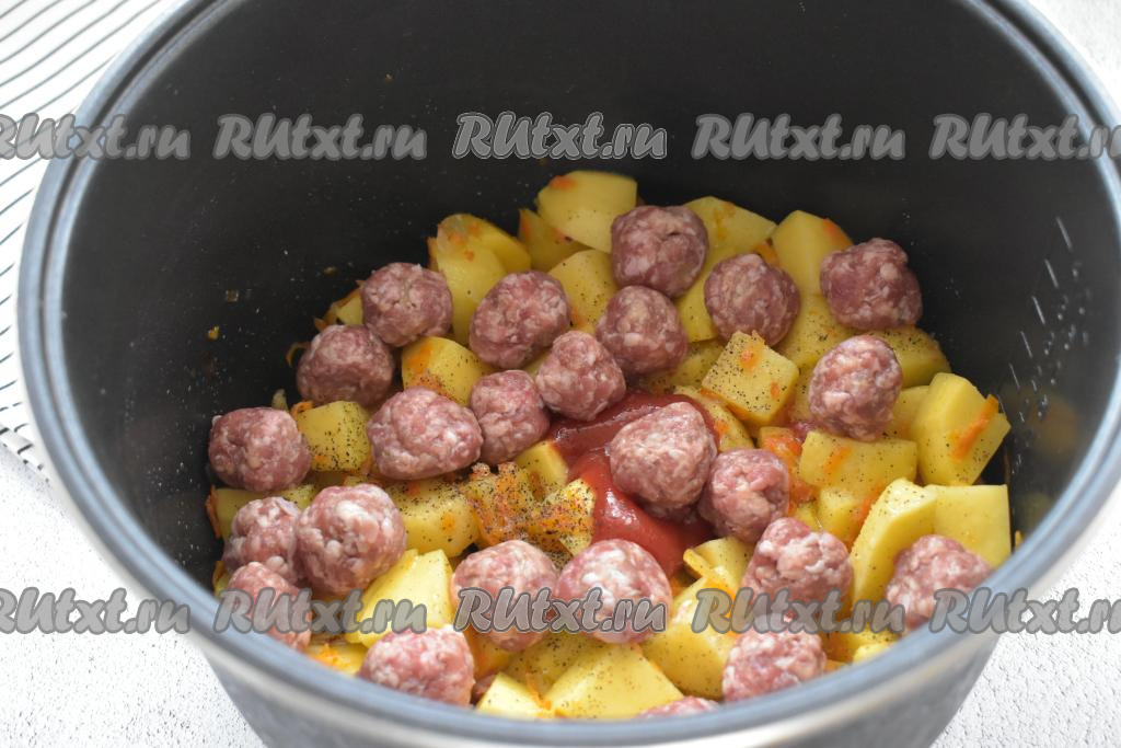 Раскладываем картошку с фрикадельками вместе с томатным соусом из чаши мультиварки по тарелкам и подаём вкусное, аппетитное, насыщенное блюдо к столу.