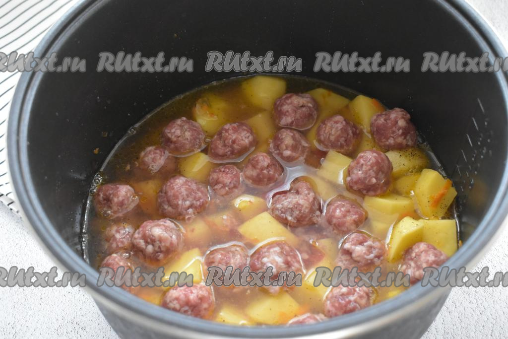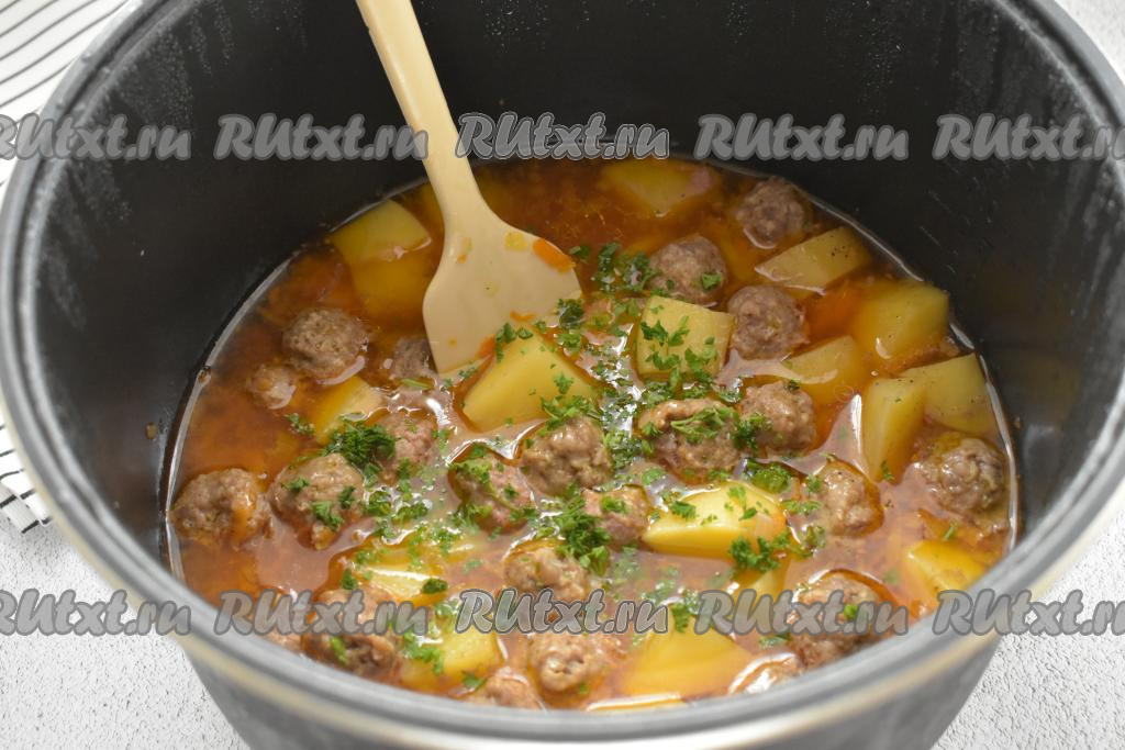 Закрываем крышку мультиварки и включаем режим "Тушение" на 45 минут. После звукового сигнала, означающего окончание режима "Тушение", проверяем готовность блюда по картофелю, он должен стать достаточно мягким, легко прокалываться вилкой. Если картошка осталась твердоватой (многое зависит от сорта картофеля и величины нарезки), тогда включите режим "Тушение" ещё на 5-10 минут. В конце приготовления к картошке с фрикадельками, по желанию, добавляем мелко нарезанную зелень (у меня - петрушка), перемешиваем.