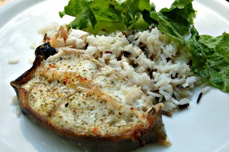Есть разные виды зубатки, самой ценной считается пятнистая зубатка, которая отличается плотной мякотью и  превосходным вкусом. Зубатка широко применяется в кулинарии, из нее варят вкуснейший суп, а также жарят и запекают. Сегодня я хочу показать, как запекают зубатку в духовке. Блюдо получается очень вкусным, нежным, диетическим. В качестве гарнира я использовала рис (смесь белого и дикого) и добавила пару листиков зеленого салата.