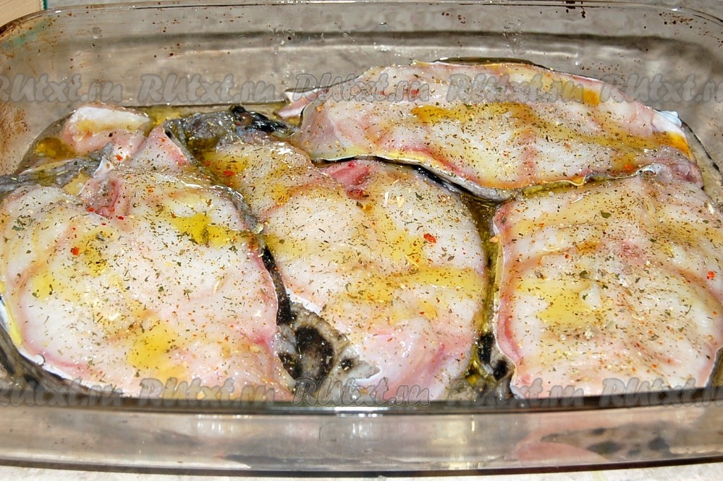 Взять форму, налить в нее  растительное масло, уложить стейки зубатки.