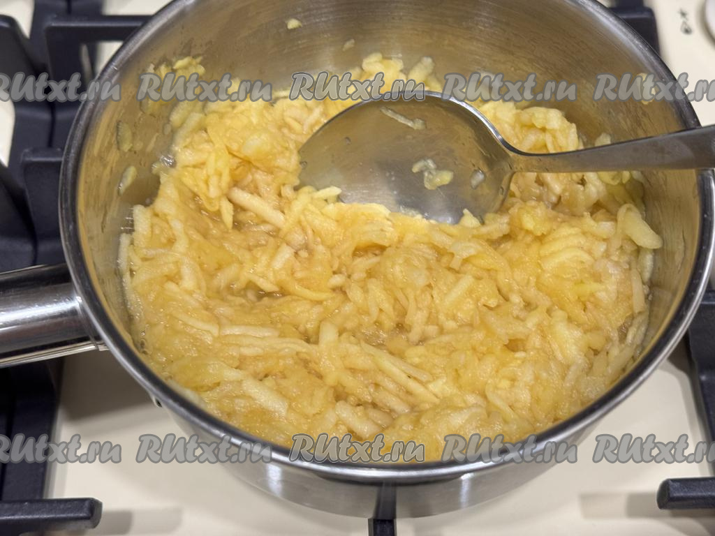 Яблоки, очищенные от кожуры, натереть на крупной тёрке, не затрагивая семенную коробку с семечками. Для приготовления мармелада потребуется 300 грамм натёртых яблок. Выложить натёртые яблоки в небольшую кастрюлю, влить 50 миллилитров воды, перемешать, поставить на огонь выше среднего.