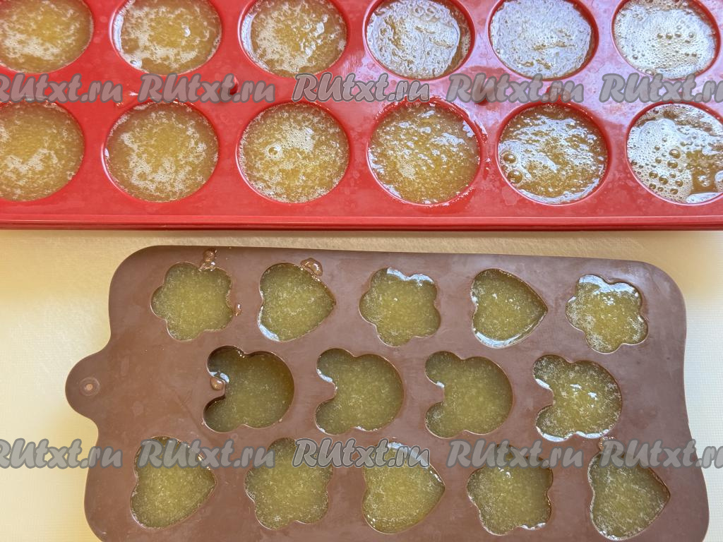 Разлить яблочно-желатиновую массу по формам. Я разлила по силиконовым формочкам для формирования конфет. Можно вылить массу в одну силиконовую форму (или в любую форму, застеленную пищевой плёнкой). Дать массе в формочках (или в одной форме) остыть до комнатной температуры, а затем отправить в холодильник до полного застывания яблочного мармелада (ориентировочно на 3-5 часов).