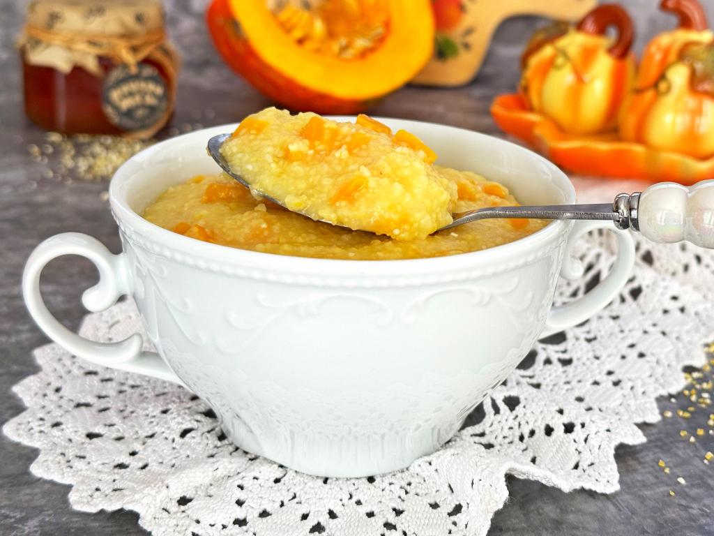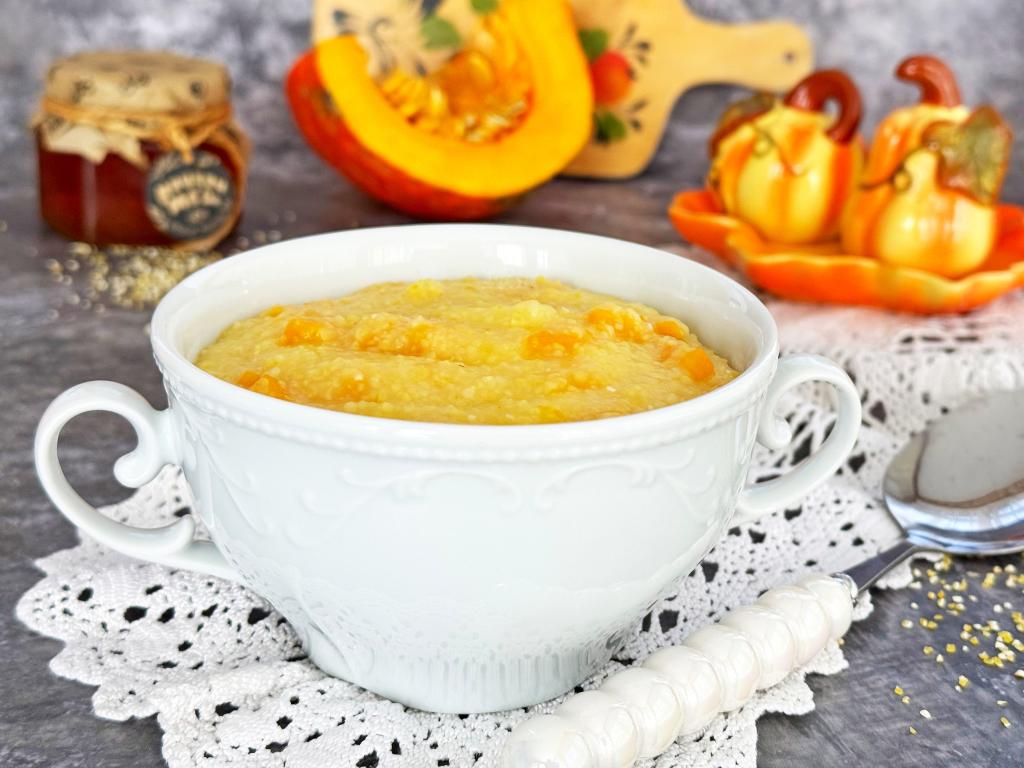 Вкусную, яркую, нежную кукурузную кашу, сваренную с тыквой на воде, подать к столу в горячем виде.