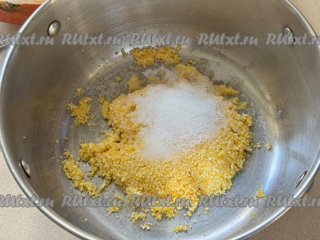 С момента закипания воды варить кукурузную кашу 15 минут, иногда помешивая. Пока каша варится, тыкву нужно очистить от кожуры и волокон с семечками. 130 гамм очищенной тыквы нарезать на мелкие кубики, чем мельче - тем лучше. По прошествии 15 минут после начала варки каши с момента закипания добавить в кастрюлю кусочки тыквы. Перемешать кукурузную кашу, дать закипеть и варить ещё 15 минут на небольшом огне, тоже иногда помешивая. В процессе варки попробовать кашу с тыквой на вкус, если необходимо, добавить сахар по вкусу.