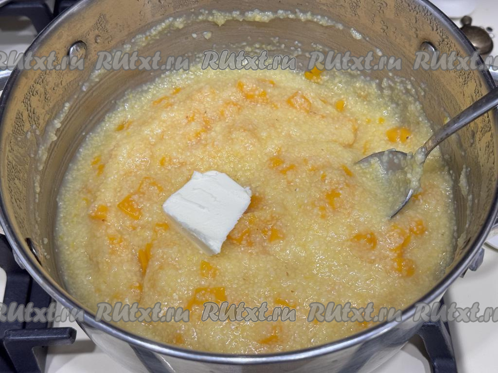После того как каша с тыквой проварится с момента закипания 15 минут, убрать её с огня. Если готовите кукурузную кашу не в Пост, тогда можно добавить в неё кусочек сливочного масла, перемешать. Кастрюлю с готовой кашей закрыть крышкой и дать настояться минут 15.