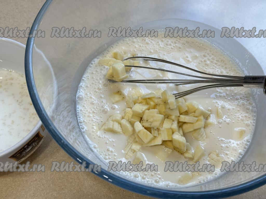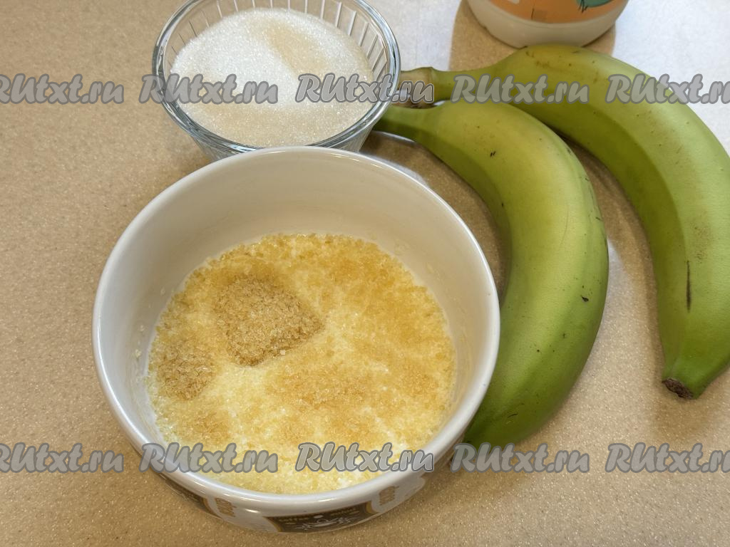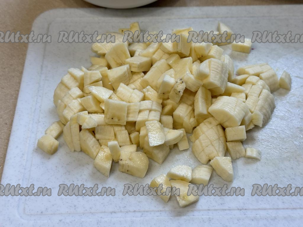 Бананы очистить, нарезать на кубики размером примерно 5 миллиметров на 5 миллиметров.