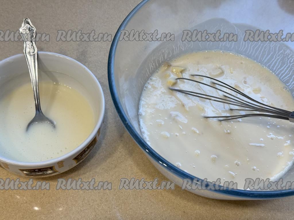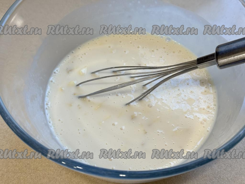 В отдельную миску влить ряженку, всыпать сахар, перемешать и оставить минут на 15 (до полного растворения сахара).