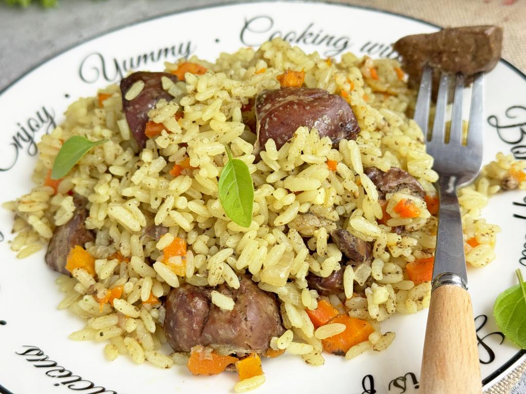 Рассыпчатый рис вместе с мягкими кусочками куриной печени разложить из чаши мультиварки по тарелкам и с пылу с жару подать к столу.