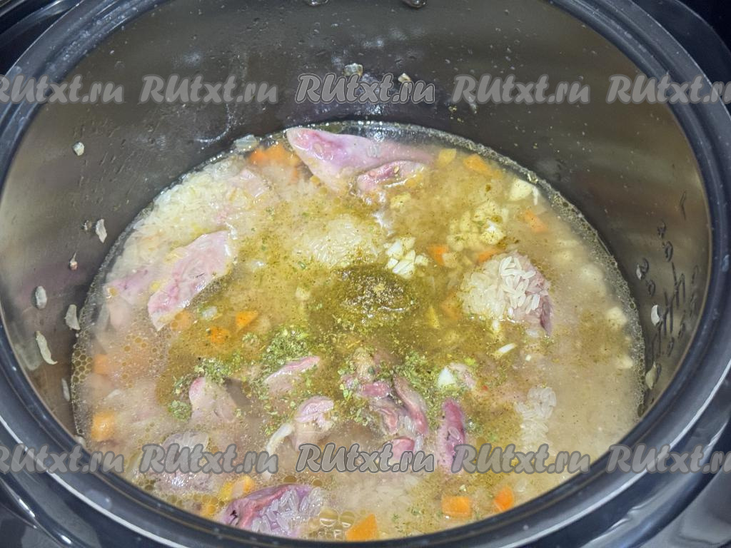 Влить в чашу 400 миллилитров воды комнатной температуры. Рис и воду я отмеряю стаканом одного объёма, то есть для приготовления 1 стакана объёмом 200 миллилитров сухого риса я добавляю 2 стакана воды того же объёма. В чашу мультиварки добавить мелко нарезанный чеснок, соль и специи.